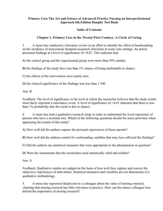 Test Bank Primary Care: The Art and Science of Advanced Practice Nursing – an Interprofessional Approach 6th Edition by Dunphy